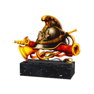 Akrylátová trofej na těžkém leštěném podstavci. Pro ocenění zlaté pozice. S retro hasičskou tématikou.